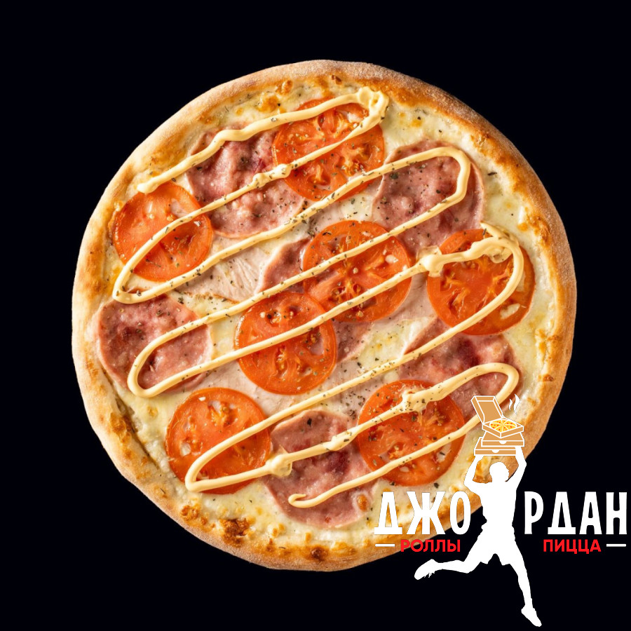 Ветчина, шапиньоны, свежие помидоры, сыр моцарелла, фирменный красный соус.