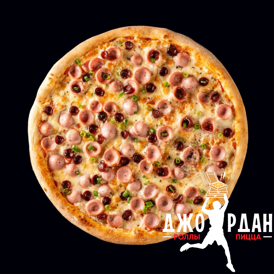 Колбаски охотничьи, копченые сосиски, молочные сосиски, сыр моцарелла, фирменный красный соус, зеленый лук