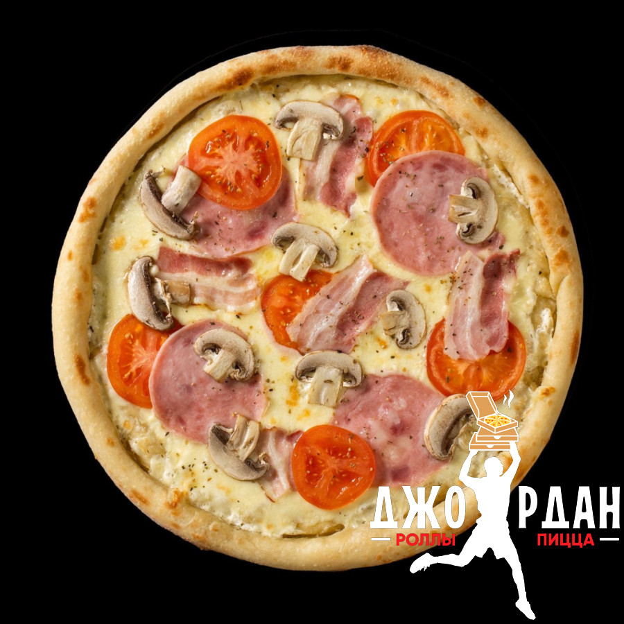 Ветчина, бекон, шампиньоны, томаты, моцарелла, фирменный белый соус