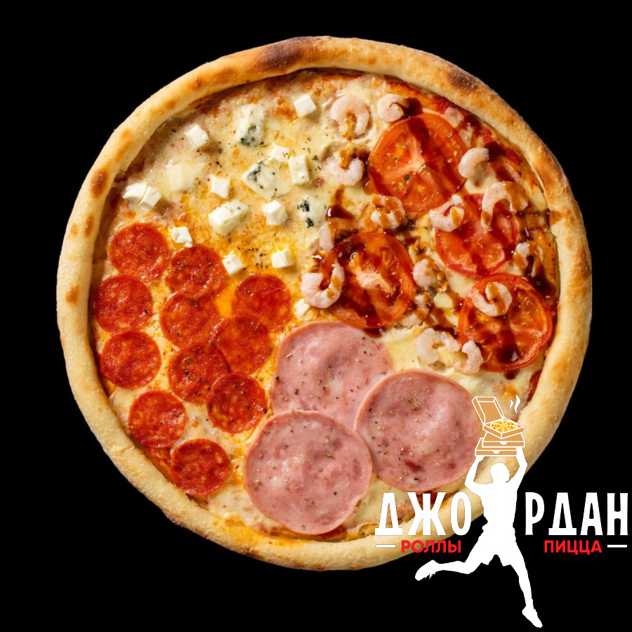 Ветчина, колбаса пепперони острая, креветки коктейльные, томаты, дор-блю, фетакса, пармезан, моцарелла, фирменный красный соус