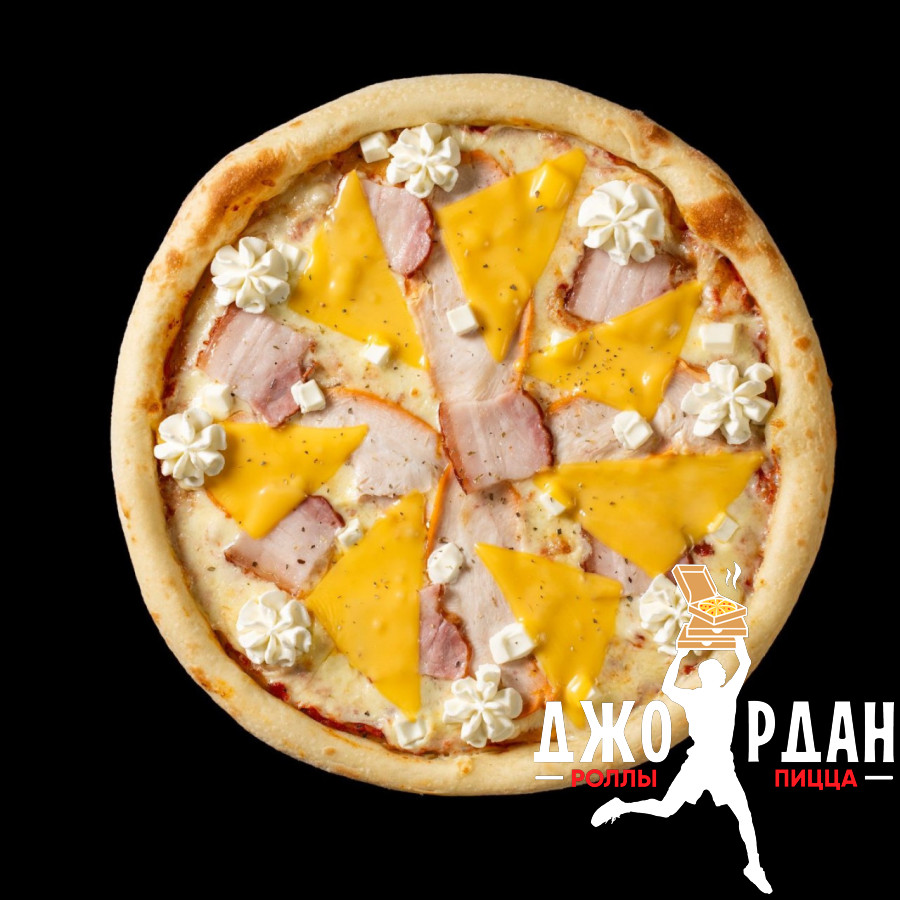 Грудинка, курица копченая, чеддер, фетакса, сыр Cremette, моцарелла, фирменный красный соус