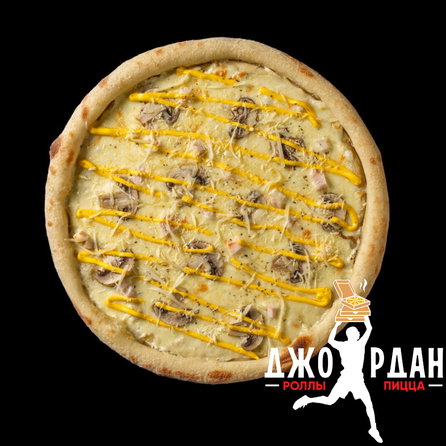 Куриное бедро, шампиньоны, моцарелла, фирменный белый соус, сырный соус Heinz, посыпана сыром пармезан